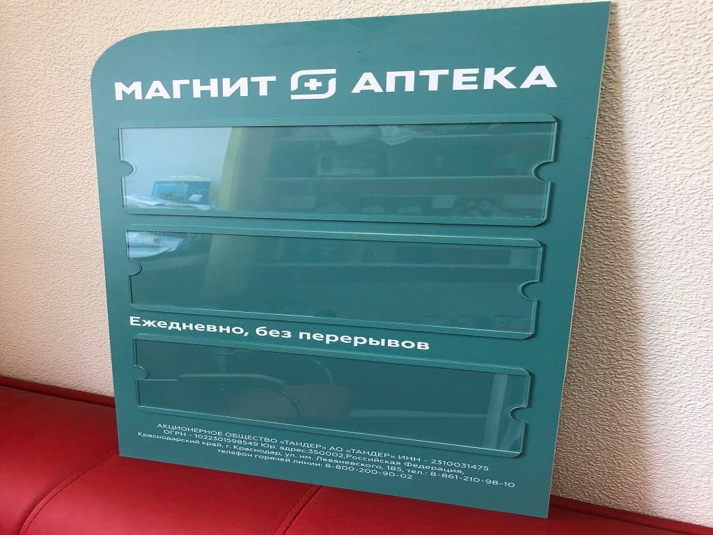 Такие таблички изготавливаются из прозрачного пластика или акрила; внутрь таблички, благодаря специальной выемки, вставляется лист бумаги, содержащий важную информацию или логотип компании.